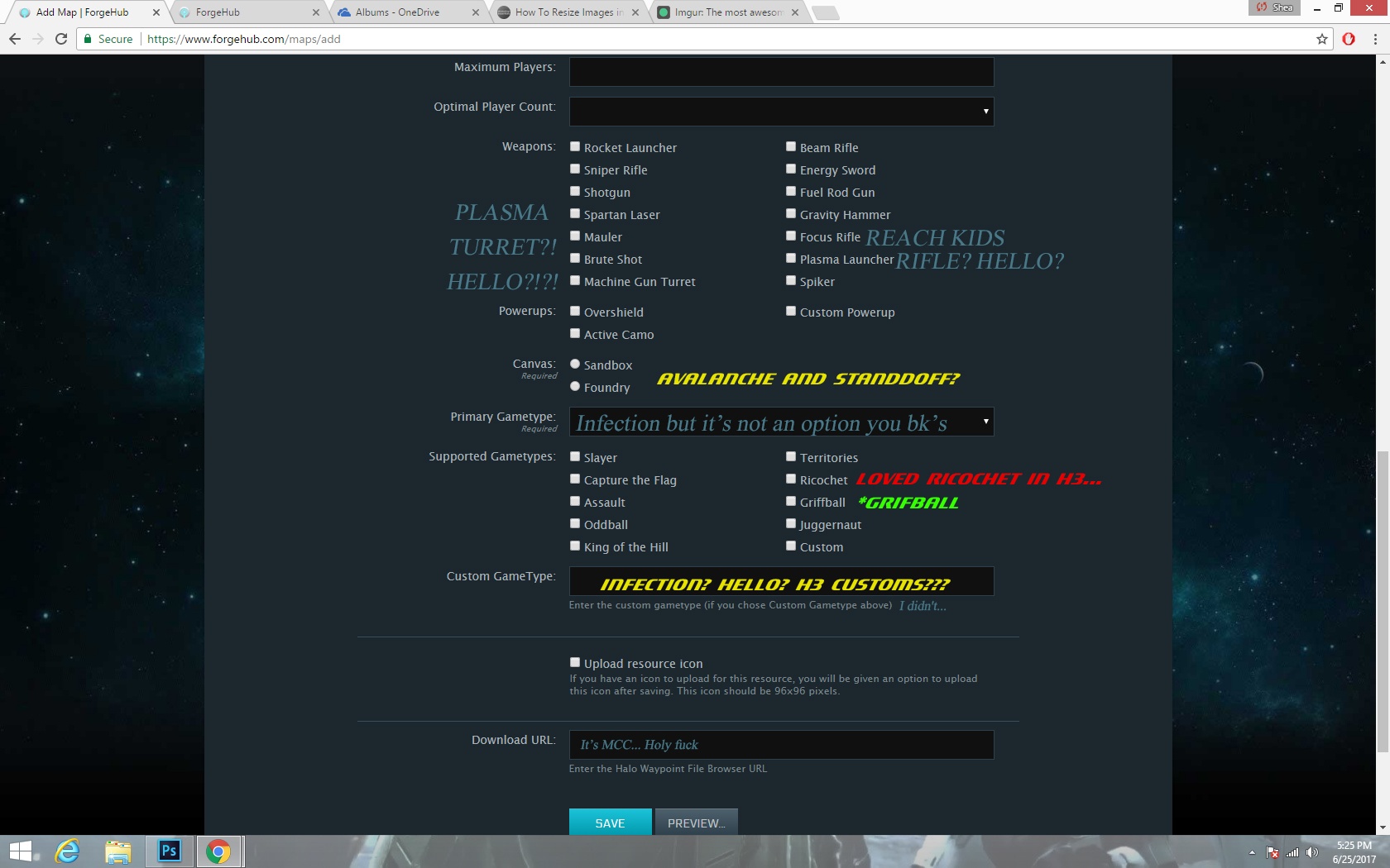 For your H2A comment in the shout box we don't have a category for them separately since they aren't in high demand at this point to warrant a separate section so just put it in Halo 2. If something is missing from the options like weapons or maps then just let me know.