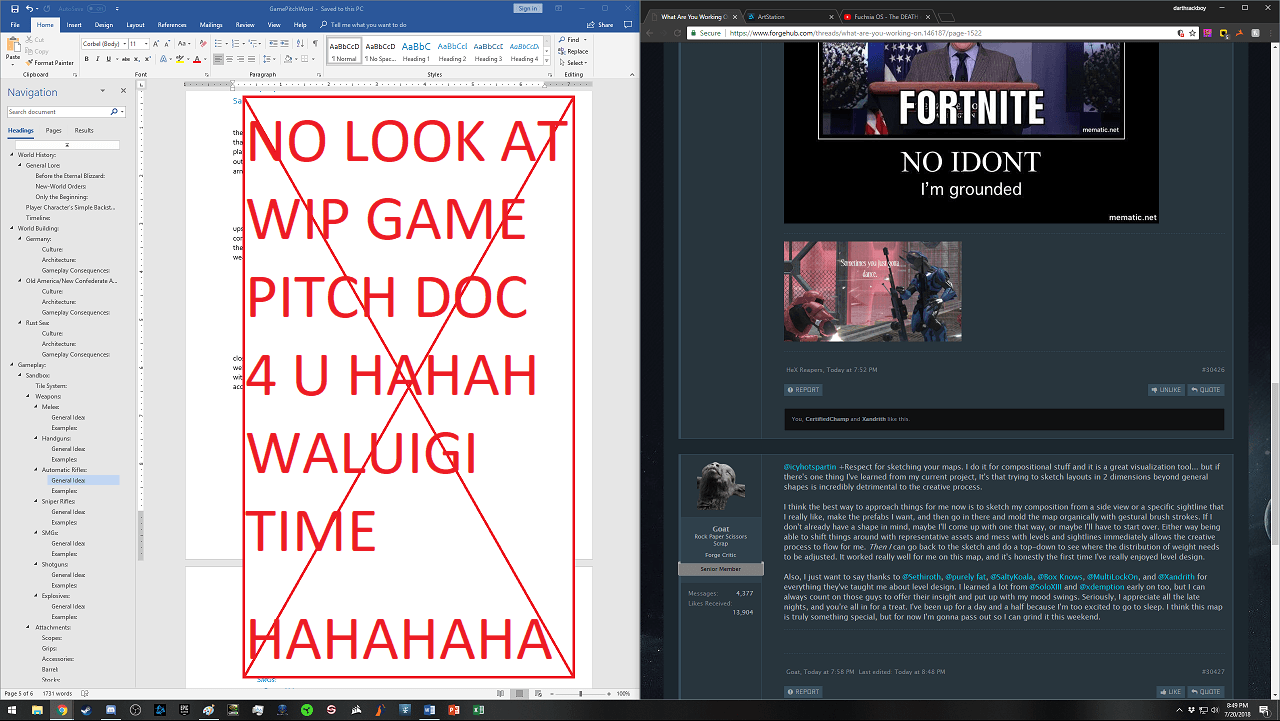 Also, I just want to say thanks to @Sethiroth, @purely fat, @SaltyKoala, @Box Knows, @MultiLockOn, and @Xandrith for everything they've taught me about level design. I learned a lot from @SoloXIII and @xdemption early on too, but I can always count on those guys to offer their insight and put up with my mood swings. Seriously, I appreciate all the late nights, and you're all in for a treat. I've been up for a day and a half because I'm too excited to go to sleep. I think this map is truly something special, but for now I'm gonna pass out so I can grind it this weekend.