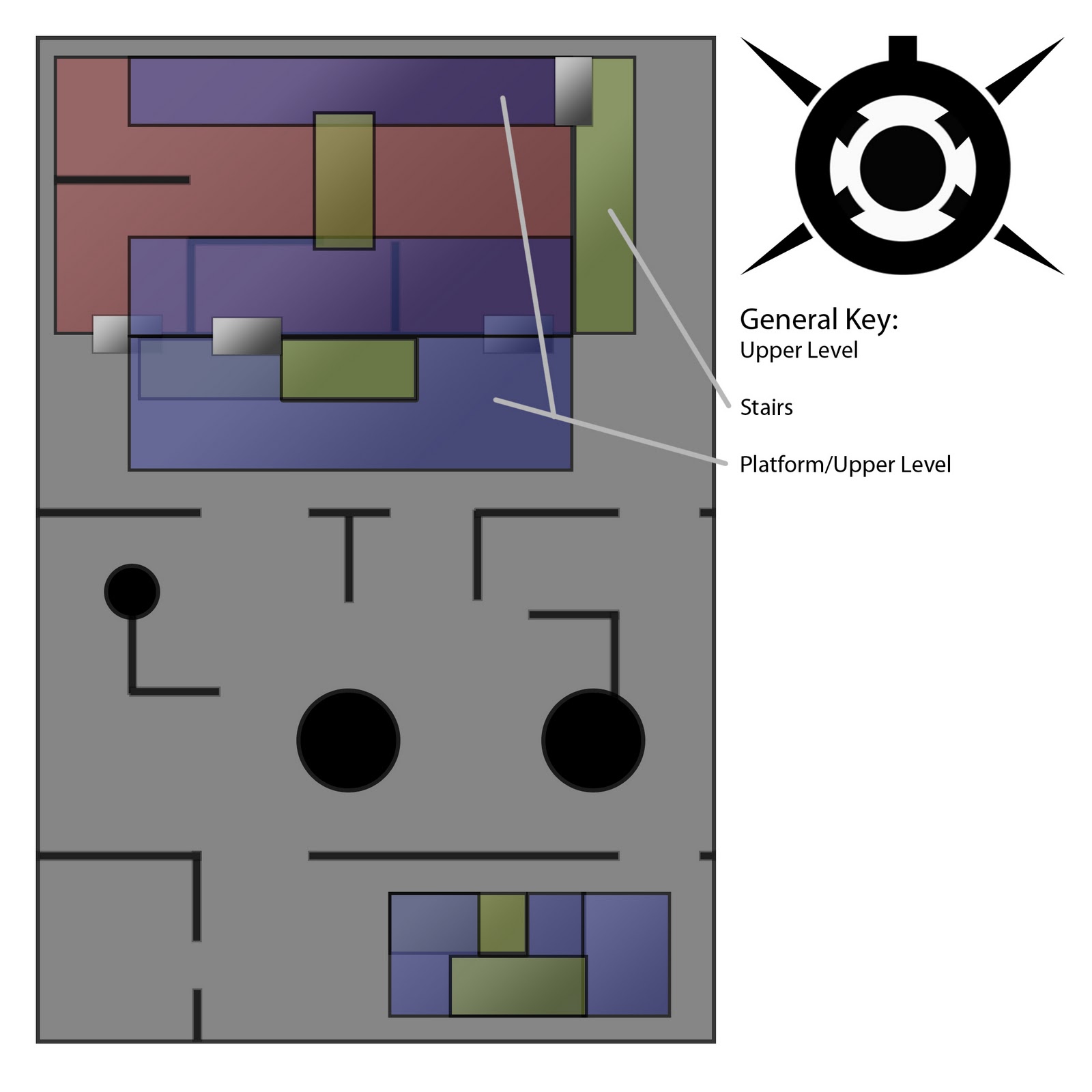 THIS TOO ---> There are multiple levels, the blue areas are ABOVE the ground level, the green areas connect the ground level to the upper levels and upper levels to higher levels even still (this map has 3 levels total). Spawns will placed as the farthest forward object, but most of these are located at ground level, save the ones placed on the blue area adjacent to, but not within, the building.