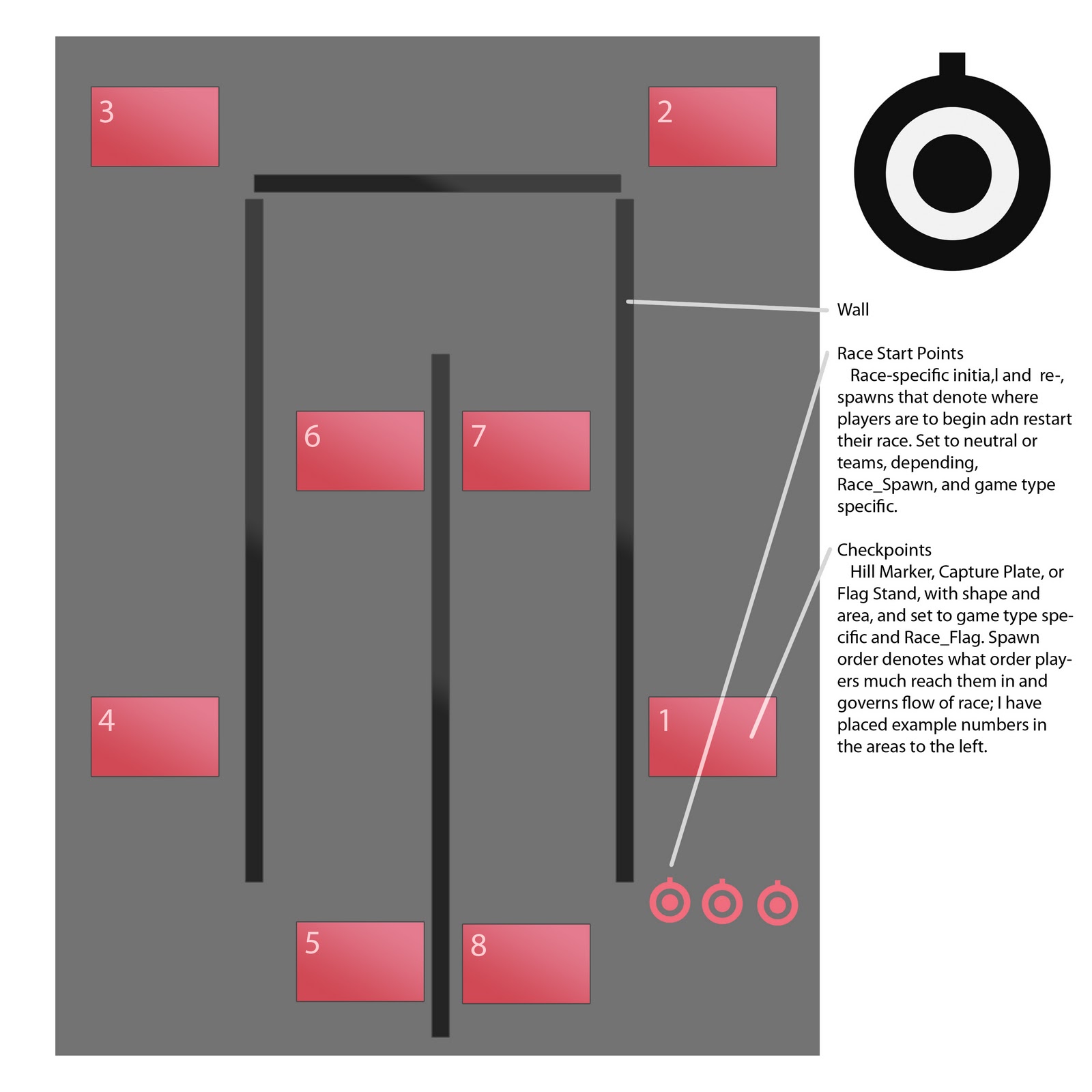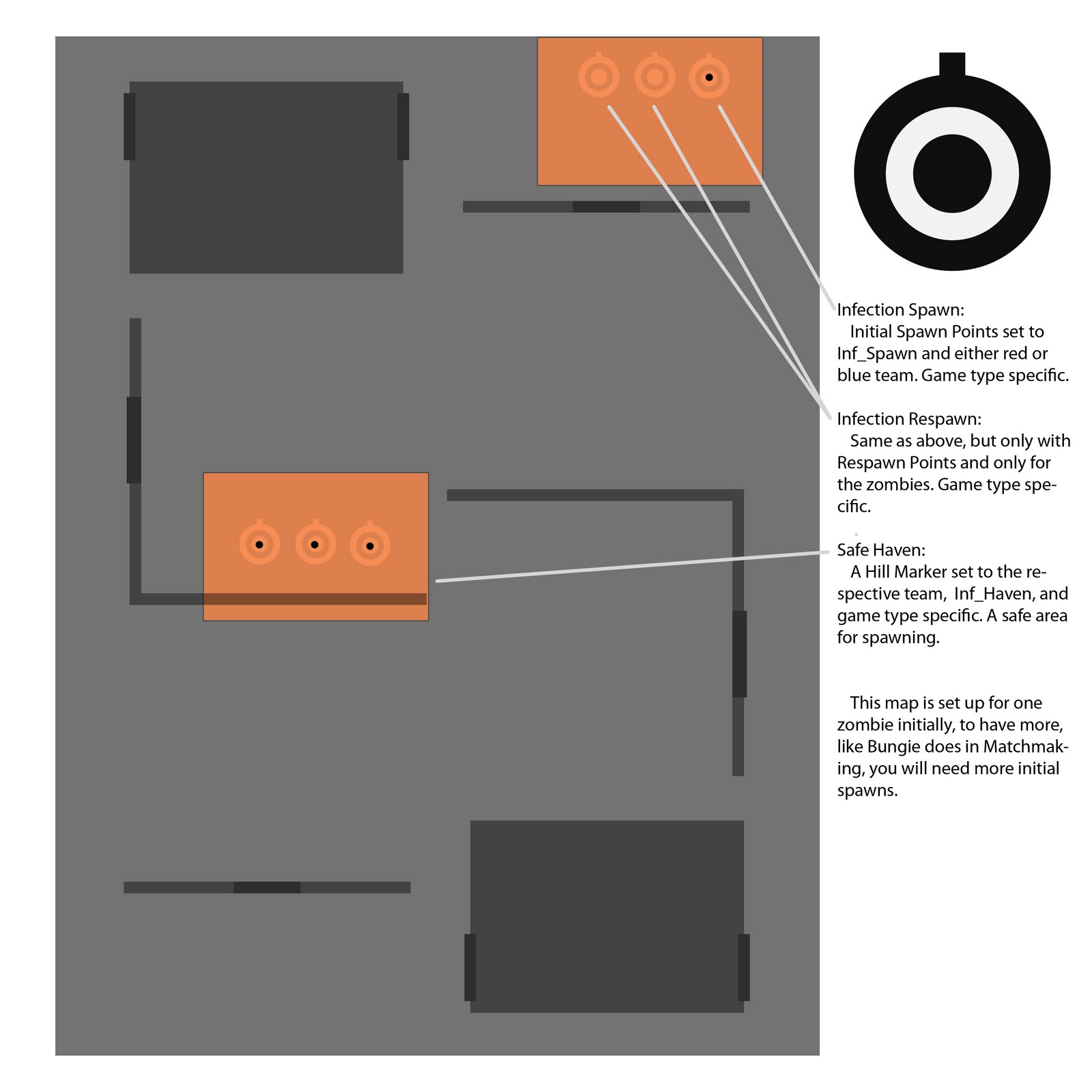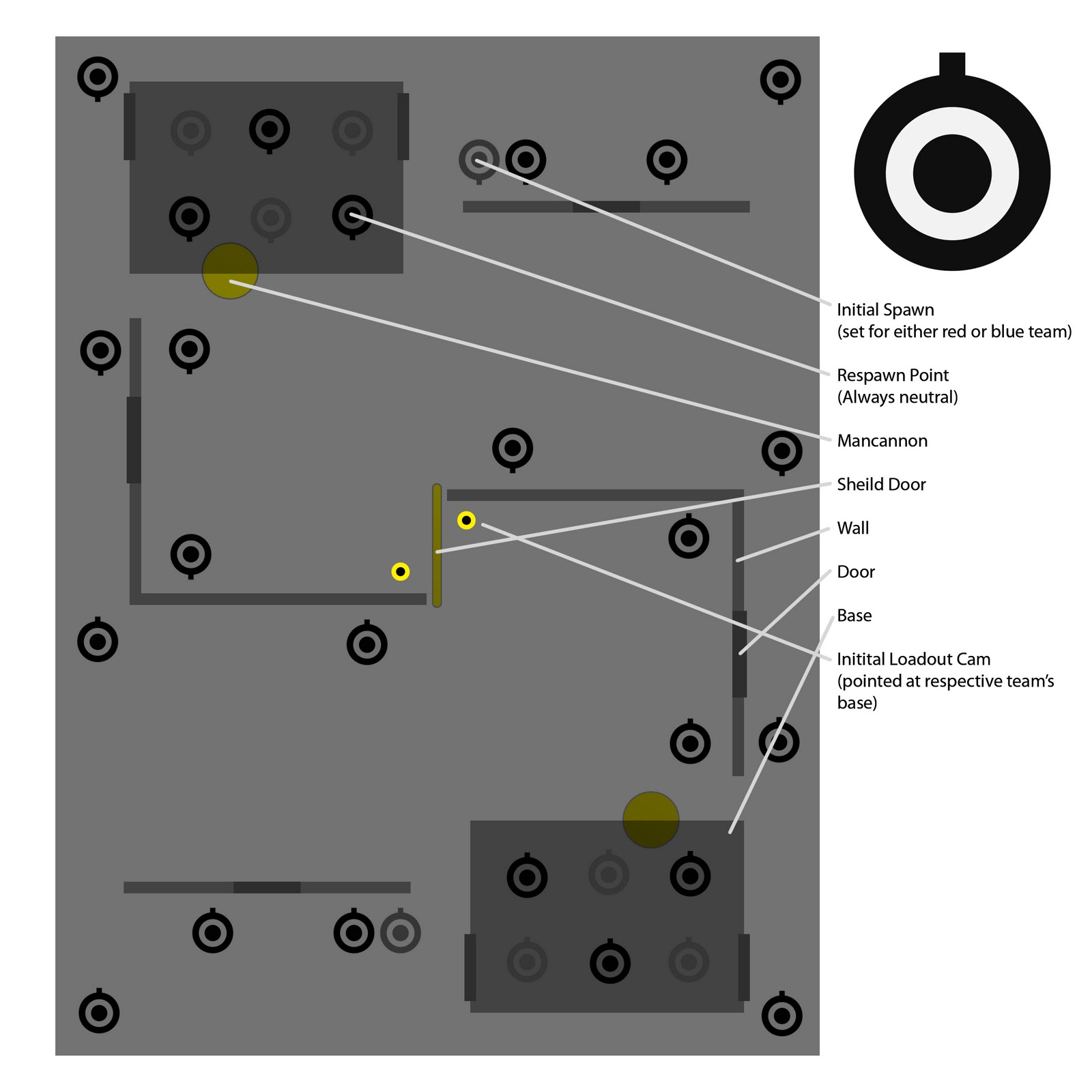 *The example map is not to scale and is very small, it would most likely not be enjoyable to play on if actually built; it is simply functional.*